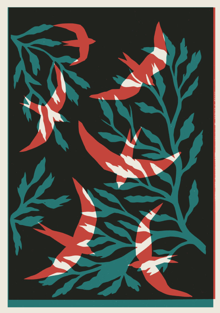 Nous avons la chance d’être accompagné depuis nos débuts par l’artiste illustratrice Phileas Dog. Elle a imprimé de splendides sérigraphies à partir des illustrations réalisées pour les programmes du printemps et de l’automne de Cosmos : Martinets, Martinets à la montagne, Géants des mers du Sud, Le Castor, Tomates au jardin, Pois gourmands.